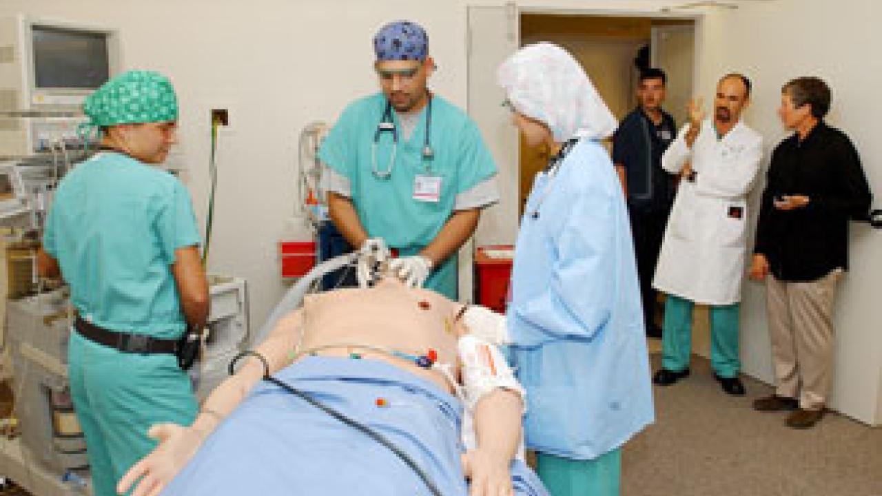 Health care professionals practice catheterization and other medical procedures on “Stan,” a patient simulator in the UC Davis Medical Center’s new SimSuite, during an open house held last week to officially welcome the state-of-the-art facility. Only four hospitals in the world are equipped with SimSuites. Patient simulators can be programmed to act like nearly any adult or pediatric patient a doctor might encounter, says Jennifer Meyer, SimSuite coordinator. Health professionals can practice common medical procedures and respond to rare and complex medical conditions and life-threatening emergencies without the fear of hurting a live patient. Here, Mojca Remskar Konia, Sundeep Tumber and Judith Hwang practice anesthetizing “Stan.” “It’s reality without risk,” Meyer says. The simulators blink, speak, breathe and have a heartbeat, eight pulse points and a variety of other anatomical features that allow students to practice intravenous drug delivery, CPR, catheterizations, basic obstetrics skills and respiratory therapy. Before or during procedures, the patient simulator might comment: “My chest really hurts” or “I think my blood sugar might be low,” giving attendants a chance to respond to developing issues during the course of treatment. The computer simulations have been developed based on real cases, Meyer says.