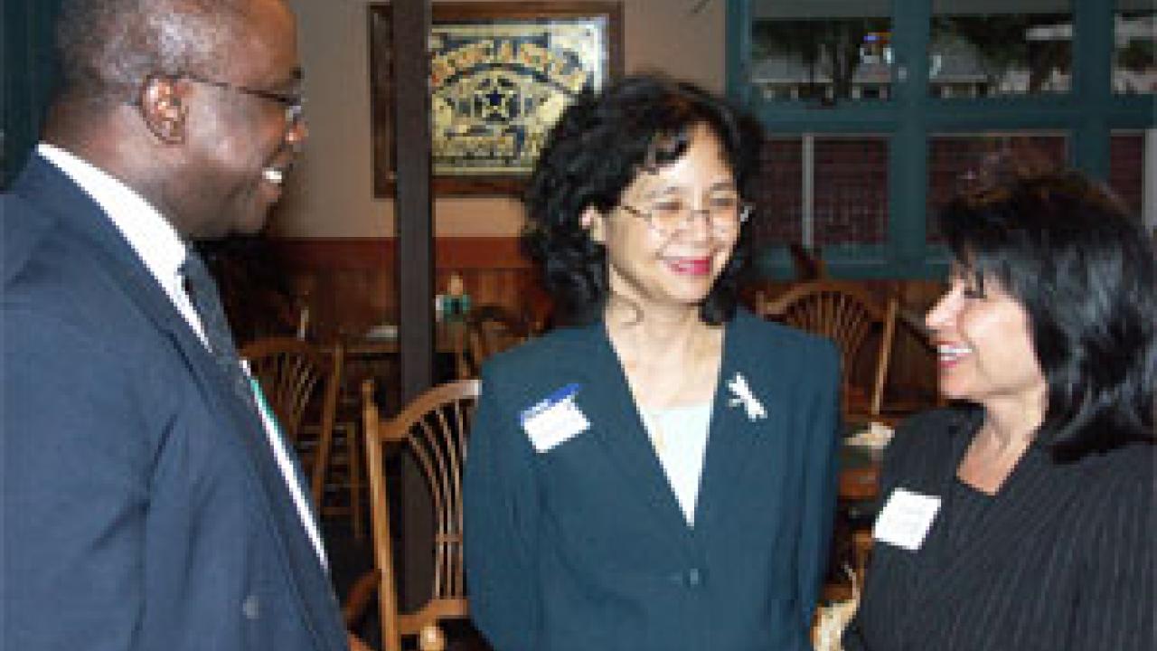 Three new upper level administrators, were all smiles following their "New Beginnings" welcome reception on Oct. 20 at the Silo Café and Pub. The event recognizing the new administrators, sponsored by the Staff Affirmative Action and Diversity Advisory Committee, was attended by more than 50 fellow staff members. From left, honored were Leon Washington, Pam Burnett and Griselda Castro. "We wanted to honor three people of color who reached upper level management," said Hispanic Staff Association member Julie Garcia, who helped organize the event. "This is in recognition of all their achievements." Garcia added that she hoped the ceremony would become an annual event. Washington took over as assistant vice chancellor for enrollment and academic support, Castro is now assistant vice chancellor for student affairs in areas including student life and housing and campus climate, and Burnett recently became director of undergraduate admissions and outreach services.