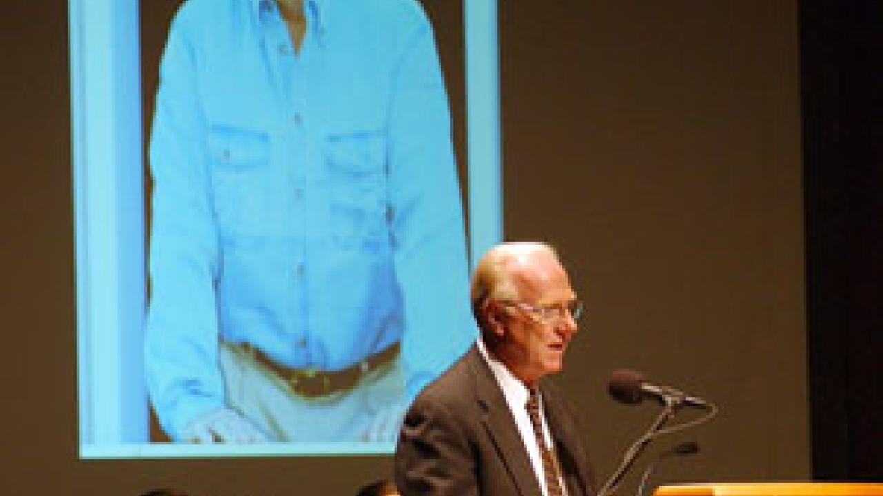 Chancellor Larry Vanderhoef eulogizes businessman, philanthropist, conservationist and author -- an avid bridge-builder between the campus and the business sector -- Charlie Soderquist, who was remembered April 23 during a tribute that drew some 500 people to Mondavi Center. Soderquist died March 2. During Friday's ceremony, he was posthumously awarded the UC Davis Medal -- the highest honor the campus accords to individuals for their contributions to the university or the broader community. A recent article in the Sacramento Business Journal underscored Soderquist's loyalty to campus: "At the heart of all of his activities, however, was an abiding devotion to UC Davis ... toward which he felt intense gratitude. He served on the UC Board of Regents, chaired the UC Davis Foundation, was president of the Cal Aggie Alumni Association, served as faculty at the Graduate School of Management, and served on the GSM Dean's Advisory Council."