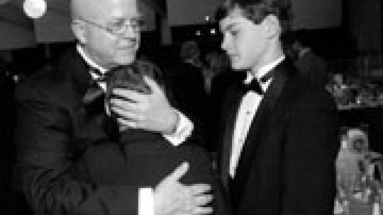 Jay Mechling, American Studies professor, hugs his grandson, Tyler McGlone, 11, at the end of the Teaching Prize Gala on May 11, as Mechling's other grandson, Devon McGlone, 14, looks on. Mechling won the 2006 UC Davis Prize for Undergraduate Teaching and Scholarly Achievement. The $30,000 prize is funded by the UC Davis Foundation through gifts from the Davis Chancellor's Club Fellows.